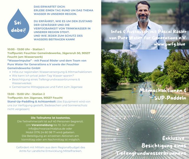 2024 tourte das Team der Initiative mit 77 Wassertagen durch Deutschland und Österreich. Vom 8. bis 13. Juli machte der Verein auch in unserer Region Station.Gemeinsam mit den Mittelschulen Feucht, Postbauer-Heng, Burgthann und der Schwarzachtal-Schule Berg sowie interessierten Bürgern veranstaltete der Verein vier Wassertage. Bereits 2023 beteiligten sich die Schulen mit jeweils einer Klasse an den Aktionstagen und waren auch im Jahr 2024 wieder mit dabei.Mehrere Stationen am, auf oder im Wasser sensibilisierten die Schülerinnen und Schüler für den Wasserschutz sowie einen nachhaltigen und achtsamen Umgang mit der kostbaren Ressource.Zur Einstimmung auf das Thema schauten die Schüler morgens in der Schule den Film „2467 km“. Der Kurzfilm dokumentiert Pascal Rößlers beeindruckendes Abenteuer – seine Reise von Deutschland über die Donau ins Schwarze Meer auf einem Stand-Up-Paddleboard (SUP). Den restlichen Tag verbrachten die Schüler gemeinsam mit dem Team am Kleinen Jägersee bei Feucht: ein stiller, künstlicher Baggersee, der der Natur überlassen wurde. Hier konnten die Schüler vier spannende Stationen durchlaufen. Neben Informationen zum Wasserkreislauf und zur Verschmutzungsproblematik in Bezug auf unsere Gewässer sammelten die Schüler den Müll auf, der sich an dem kleinen Baggersee angesammelt hat. Dabei lernten sie viel über die Auswirkungen von Umweltverschmutzung und erlebten die Artenvielfalt der Natur an dem Kleinen Jägersee. An einer Kreativstation malten die Kinder und Jugendlichen Wasserbilder, die abschließend eingesammelt und eingescannt wurden. Am Ende der Wassertage-Tour entsteht aus allen gemalten Bildern der 77 beteiligten Schulen ein digitaler Wassertropfen.